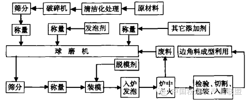 以粉煤灰、废弃玻璃等主要原料,添加辅料、发光剂,经过细碎、粉磨,形成混合均匀的配合料,将配合料装入模具,在加热炉中加热到750~900℃,配合料开始熔融,形成一种具有粘弹性的物质,变成了像气球一样的粘弹体。此时混合在配合料粉末中的发泡剂发生反应生成气体,被具有粘弹性的玻璃熔融体所包裹,形成封闭气泡,若生成气体的压力较大,则会有部分气体冲破玻璃的包围,而形成连通气孔。保温一段时间后,令其快速冷却固化,则气体被固态玻璃包裹,