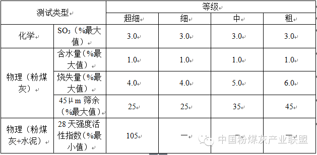 澳大利亚粉煤灰年产生量在1300多万吨左右。澳大利亚将粉煤灰的综合利用分为三类。一是用作胶凝材料类,主要是用于水泥、混凝土制品、砂浆、矿物填料等;二是非胶凝材料类,主要包括用作结构填料和用于路堤、路基和地基、土壤改良、农业、集料等;三是特殊领域,包括矿业(如回填)、废弃物固化剂等其他相关应用。其粉煤灰标准如下: