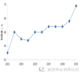 由图1可见,中国每年发电量都在不断增加,20l5年粉煤灰的产量或达到5.8亿t左右。图2为中国粉煤灰的利用情况。由图2可见,中国粉煤灰利用率逐年增加,不过最近几年一直保持在67%左右,到2015年有望突破70%。目前,中国粉煤灰年排放量仍达到上亿吨,粉煤灰的总堆存量有十几亿吨。粉煤灰不合理的堆积和不恰当的处理导致大面积土地资源被侵占和浪费,造成土地的退化,对人类健康和生态环境产生了严重的危害 。