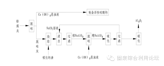 石灰烧结法是将粉煤灰与石灰(如加入石灰石) 在温度大于1100℃下反应形成难溶于酸碱的硅酸二钙 (2CaO·SiO2) 和易溶于酸碱的七铝酸十二钙( 12CaO·7Al2O3)。铝酸钙转化为溶液,而硅钙渣以固体残余物形式被分离出来。浸出后,铝富集在溶液当中,向溶液通入 CO2使其转变为 A1(OH)3沉淀。再将沉淀般烧分解, 得到最终产物α一氧化铝和β一氧化铝。得到的固体残渣再烧结混合石膏研磨生产水泥。 石灰烧结工艺流程如图4所示。