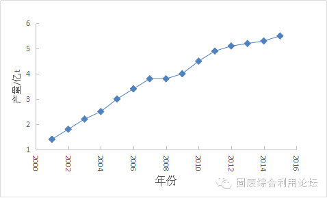 粉煤灰是燃煤电厂排出的固体废弃物。随着燃谋发电的需求量不断上升,粉煤灰的产量也大大超过预期。图1为中国2001-2015年粉煤灰的产生情况。