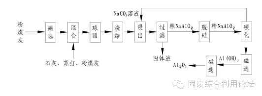 石灰、苏打和粉煤灰混合反应生成可溶性的铝酸盐和不溶性的钙硅酸盐,而在高温下(通常为1100~1400℃)不可避免会产生其他的化合物。因此,碱石灰烧结法也包括对浸出液的净化过程。其方法是将浸出所得到滤渣过滤,用 Ca(OH)2悬浮液在高温、高压下沉淀处理所有溶解的氧化硅,再用拜耳法或者通入 CO2水解沉淀氧化铝,再将沉淀经分离、煅烧转化为氧化铝。碱石灰烧结法工艺流程见图 5。