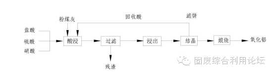 陈朝轶等使用取自神华集团的循环流化床粉煤灰做了实验。将粉煤灰与硫酸溶液在反应釜中反应,得到酸浸滤液和酸浸滤饼,酸浸滤液冷却结晶后得到粗硫酸铝晶体,再经溶解、除杂、沉淀,得氢氧化铝粉体,将氢氧化铝粉体煅烧即得氧化铝粉末。在硫酸初始浓度为3.7mol/L、液固体积质量比为5:1、浸出温度为180℃、浸出时问为5h的条件下,氧化铝的浸出率可达94.16%,并且其他杂质浸出率很低。神华集团与吉林大学和贵阳铝镁设计研究院联合研发,采用一步酸浸法并用盐酸溶解粉煤灰,经分离洗涤、过滤除杂、蒸发结晶和高温煅烧等流程,回收的氧化铝满足冶金级标准。在2011年8月建成了试点规模工厂,实现回收氧化铝超过4000t,回收率达到80%。
