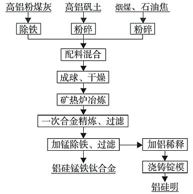 图3 高铝粉煤灰制备硅铝明和铝硅锰铁钛合金流程