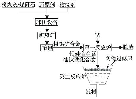 清华大学的孙俊民等申请了利用高铝粉煤灰制备硅铝明和铝硅锰铁钛合金的方法(图3)。该方法制备的铝硅明(即铝硅合金)含铝可达85%左右,同时获得的铝硅锰铁钛合金多元铁合金可作为炼钢的脱氧剂。