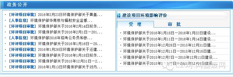 5.环境影响评价信息。实施《建设项目环境影响评价政府信息公开指南(试行)》,定期对建设项目环境影响评价文件、建设项目竣工环境保护验收和建设项目环境影响评价资质申报情况在部网站公示受理情况、发布拟审查公示和审批决定公告,做到了环评信息主动、及时、全面公开。在部政府网站首页设立环评资质管理专栏,实现环评资质受理、审查、审批信息和审查程序、审查内容信息以及环评机构和环评人员基本信息全公开。开展建设项目环评公众参与政策研究。督导检查各省(区、市)环评信息公开情况。