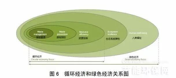 从本质上说,经济增长同时要维护生态系统弹性,防止人类福祉受到影响。资源效率提高是实现该目标的核心,这也是循环经济的目标。因此,某种意义上循环经济可看作是绿色经济的核心(见图6)。