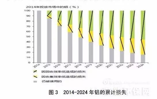 另一个关于物质损失的例子是铝随时间变化的累计损失(见图3)。计算方法是基于威布尔分区模型,参数选择6个月作为平均使用周期进行模拟。该图表明,即使在较为循环的系统中,铝的收集和预处理率达到97%,冶炼过程实现97%的回收利益率,但十年后也仅有16%的铝仍保持在该循环中。